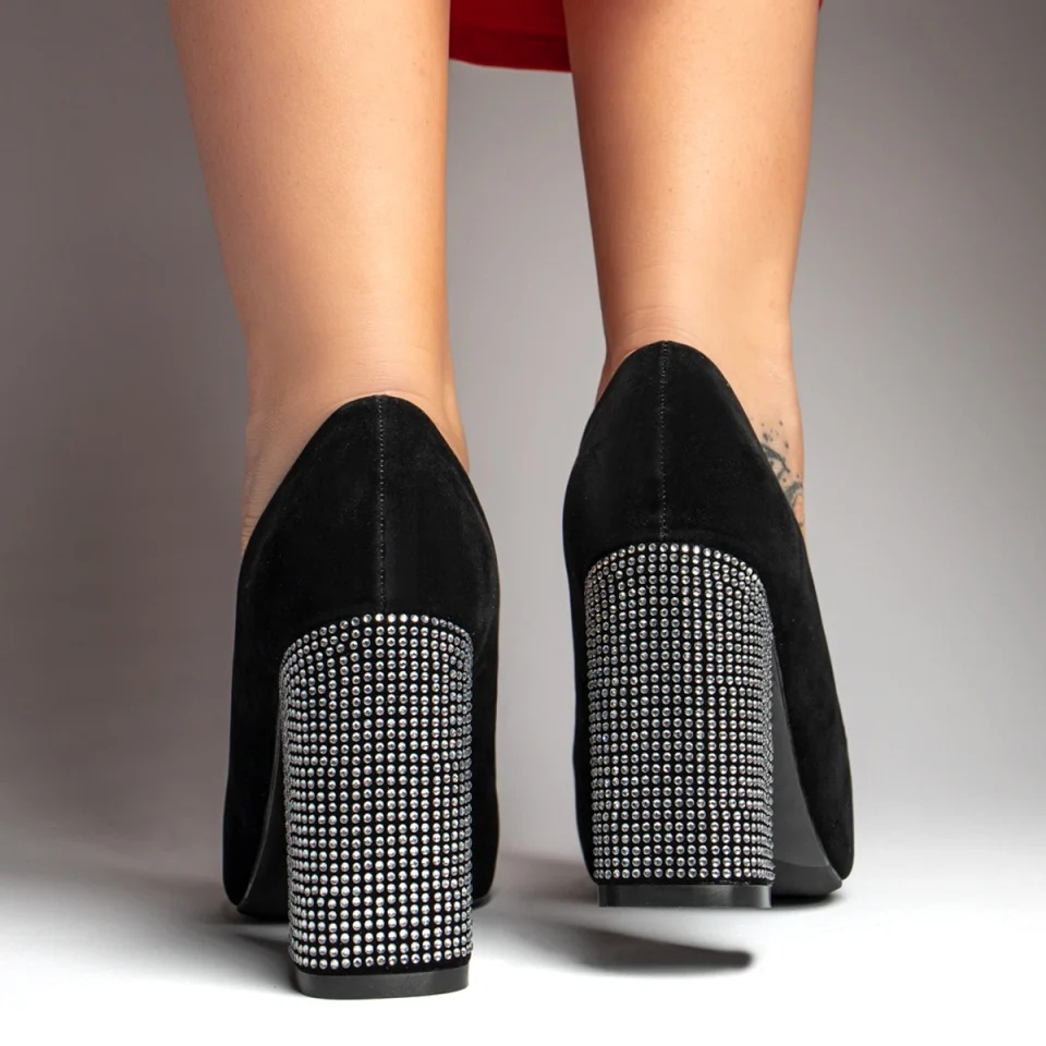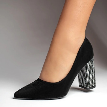 Pantofi dama cu toc gros si strasuri aplicate negru suede MOD11938